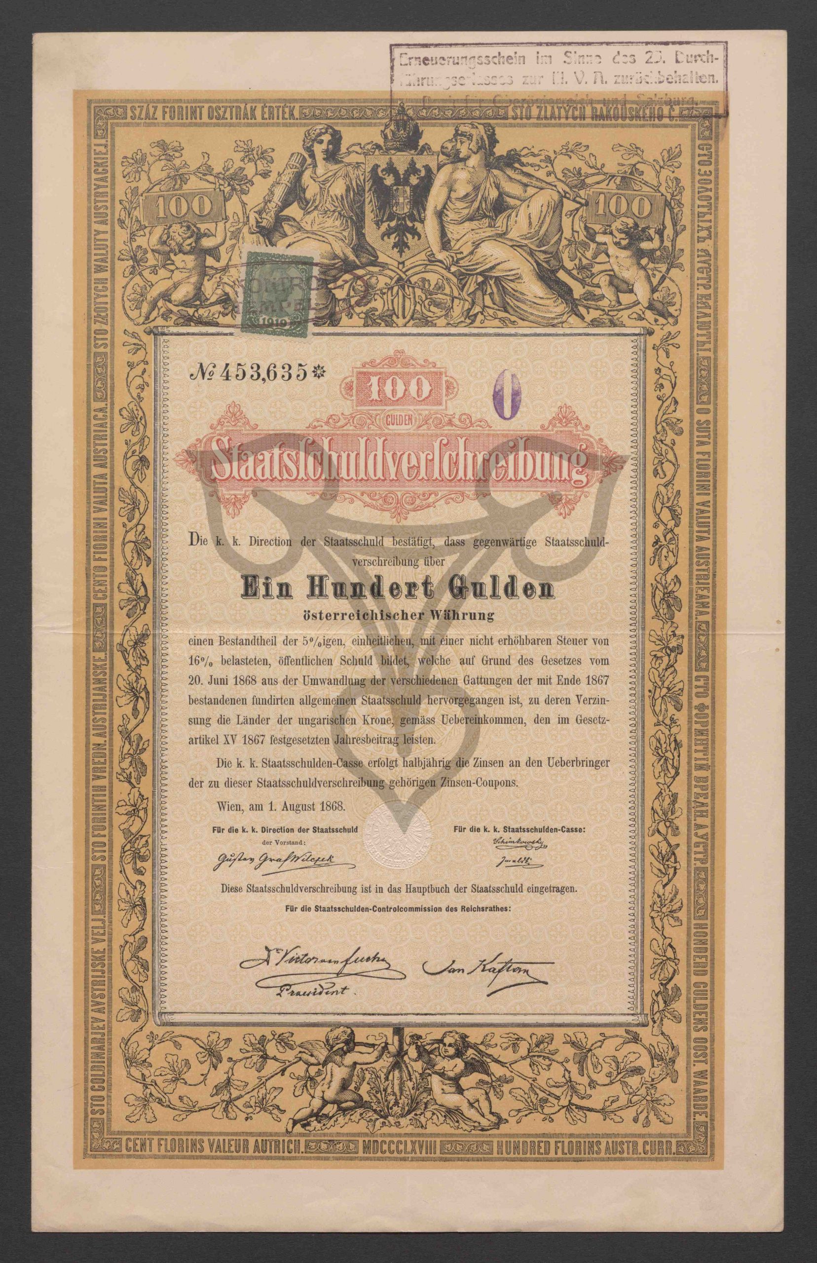 100 Gulden Staatsschuldverschreibung. Ein Hundert Gulden österreichischer Währung, No. 453.635