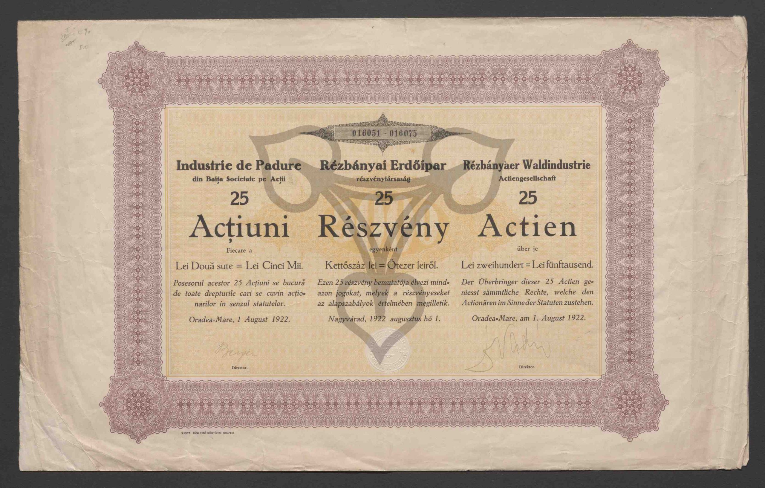 25 Actien über je Lei zweihundert = Lei fünftausend. 016051 – 016075