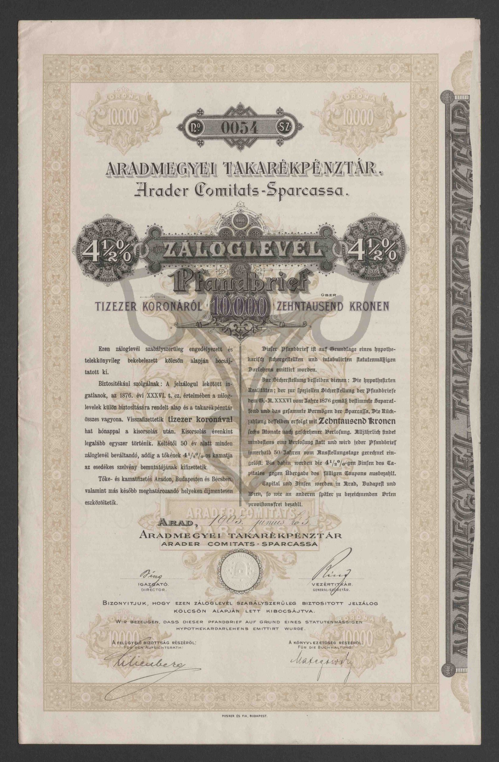 Originaltitel: 4 1/2 % Záloglevél: Tizerer Koronáról 10.000. 0054 .sz.