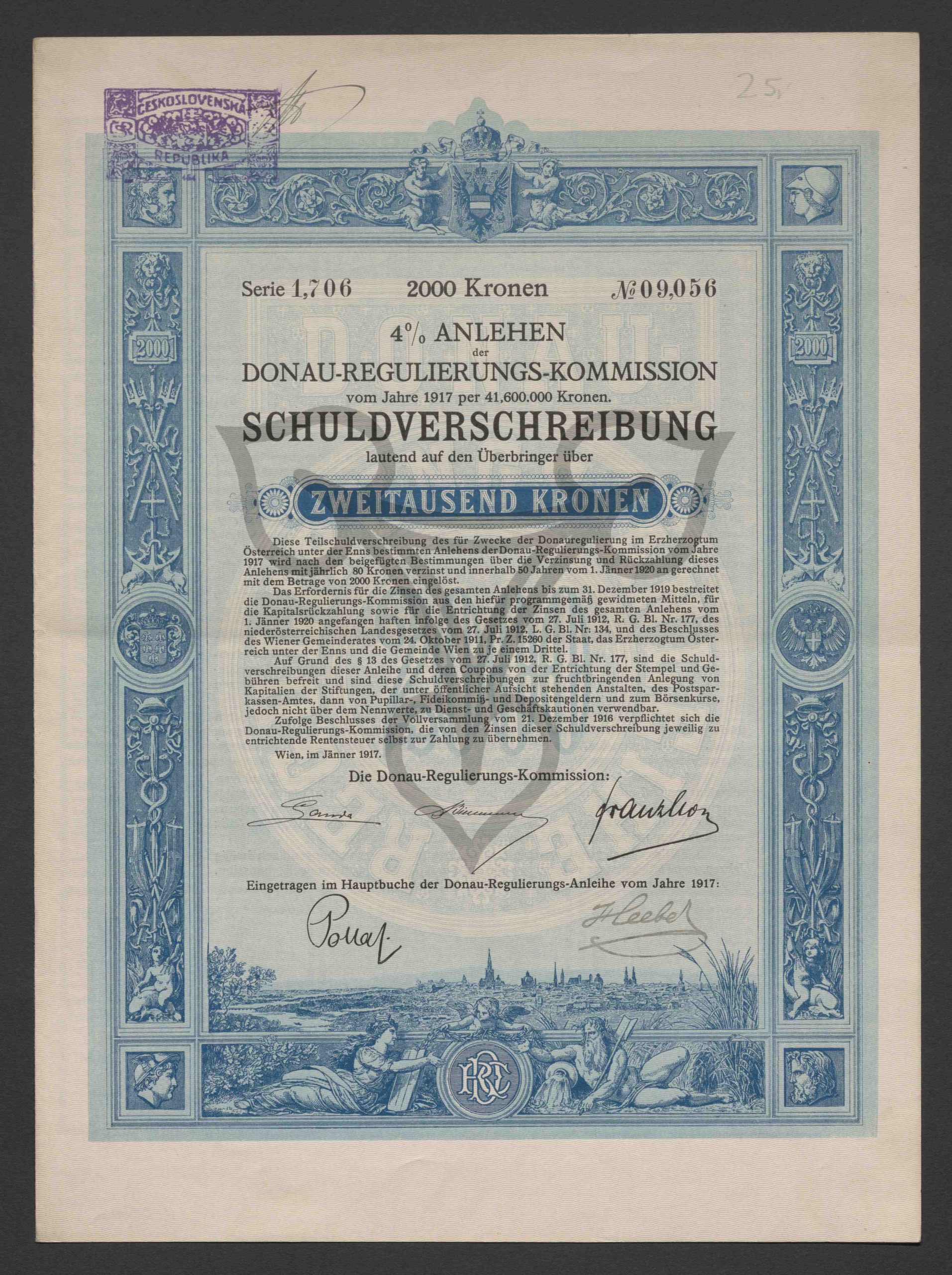 4 % Anlehen vom Jahre 1917 per 41.600.000 Kronen. Schuldverschreibung lautend auf den Überbringer über Zweitausend Kronen, Serie 1.706, No. 09.056