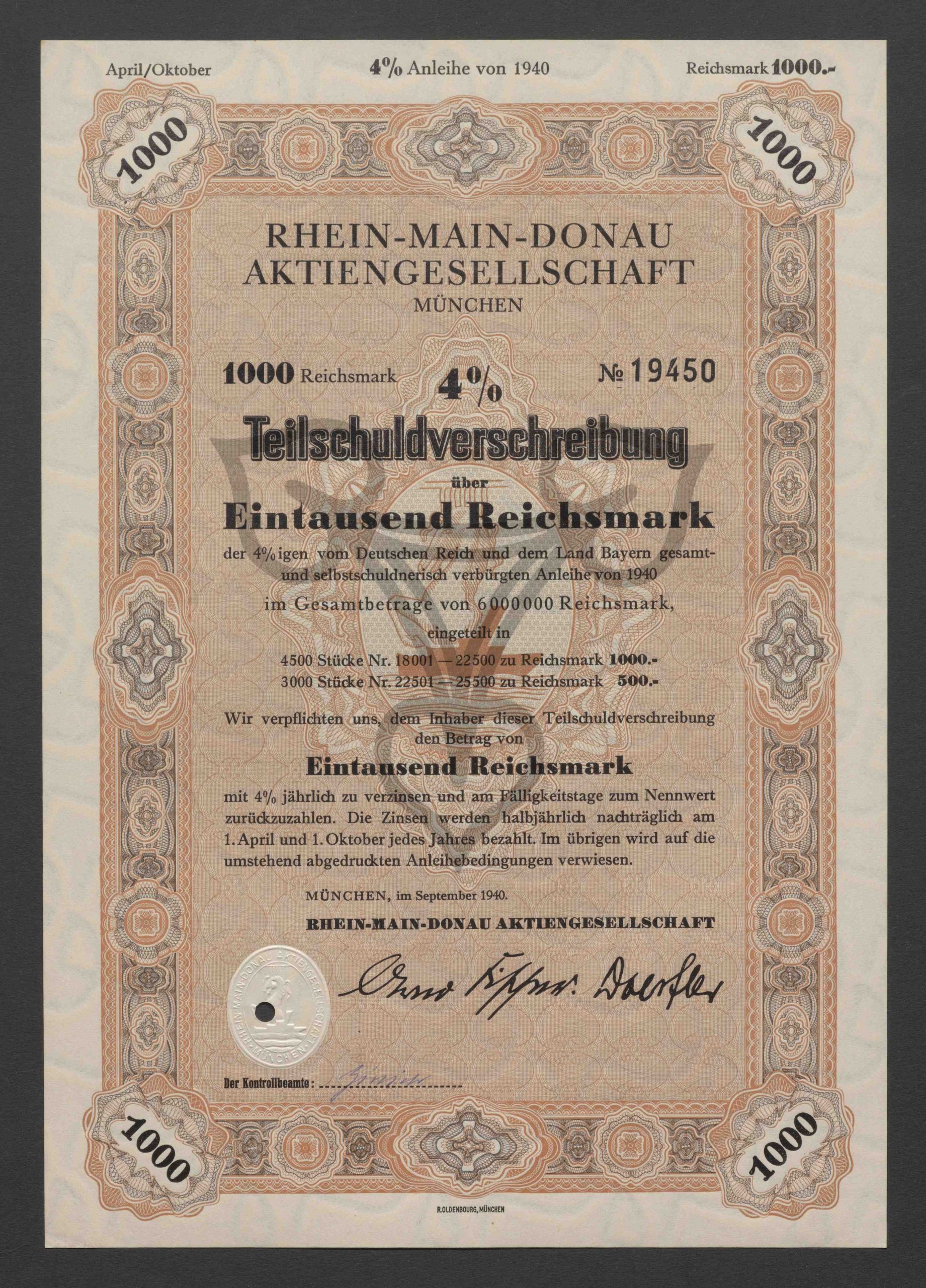 4 % Teilschuldverschreibung über Eintausend Reichsmark, No. 19450