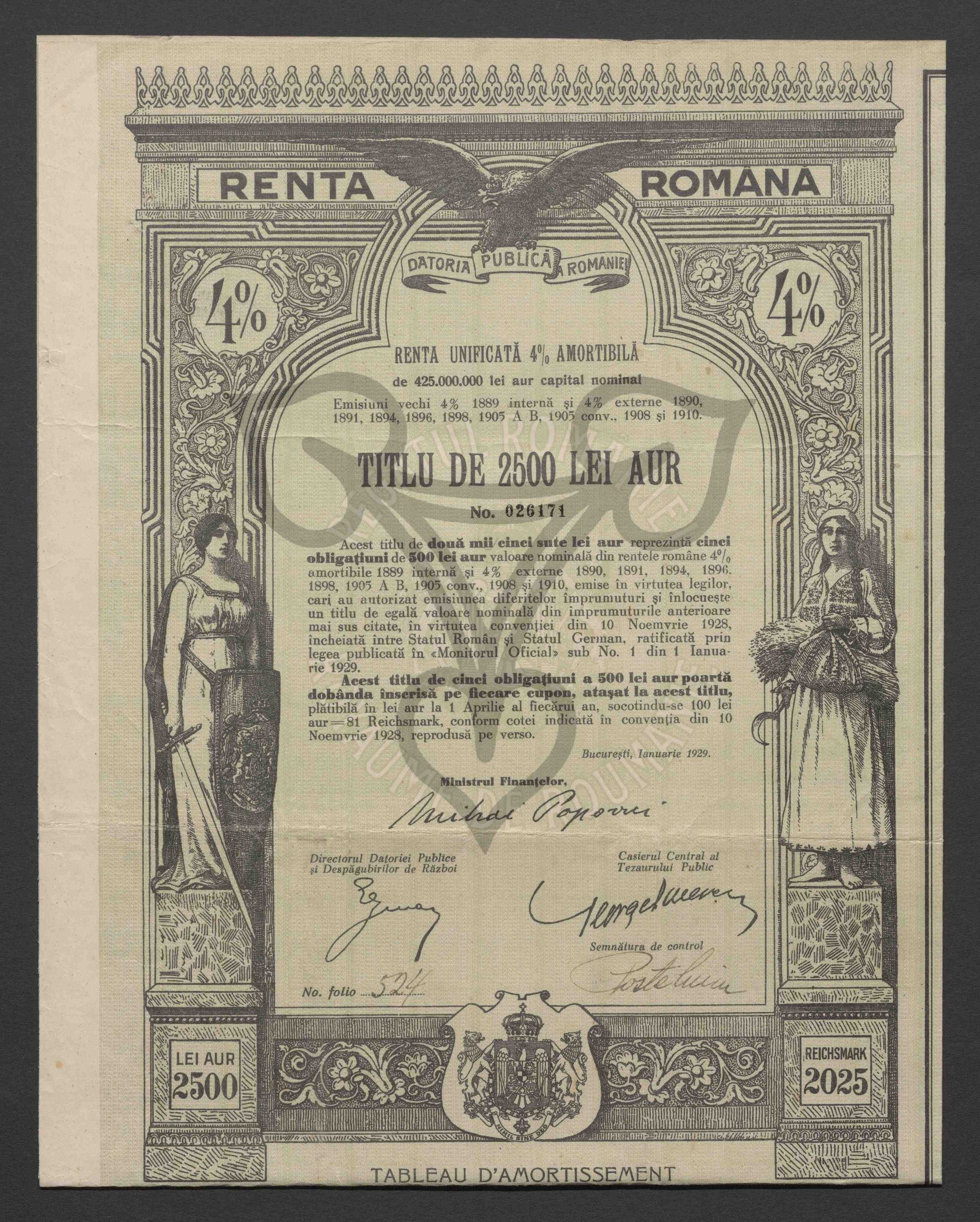 Originaltitel: Renta unificată 4 % amortibilă de 425.000.000 lei aur capital nominal, Titlu de 2500 lei aur No. 026171