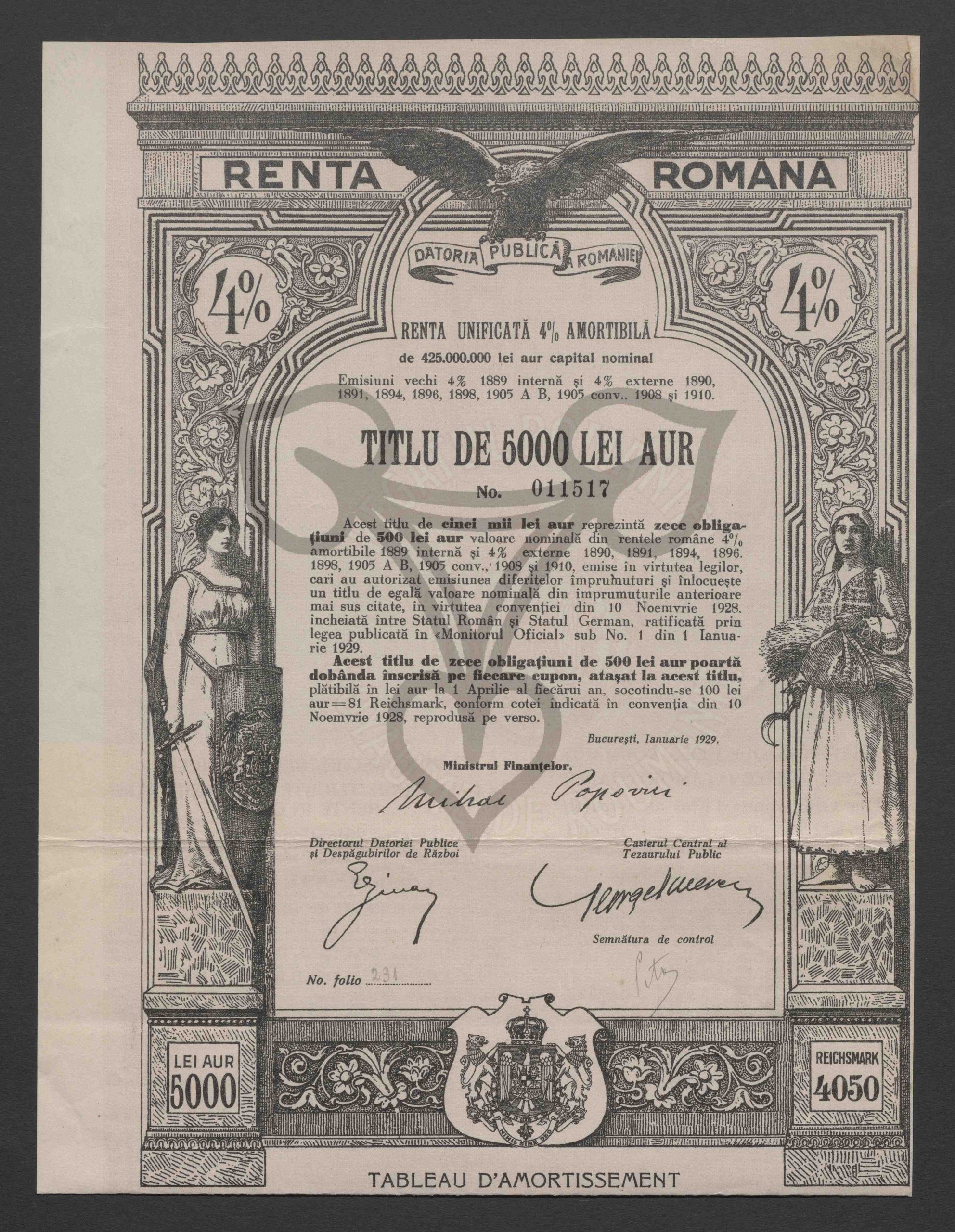 Originaltitel: Renta unificată 4 % amortibilă de 425.000.000 lei aur capital nominal, Titlu de 5000 lei aur No. 011517