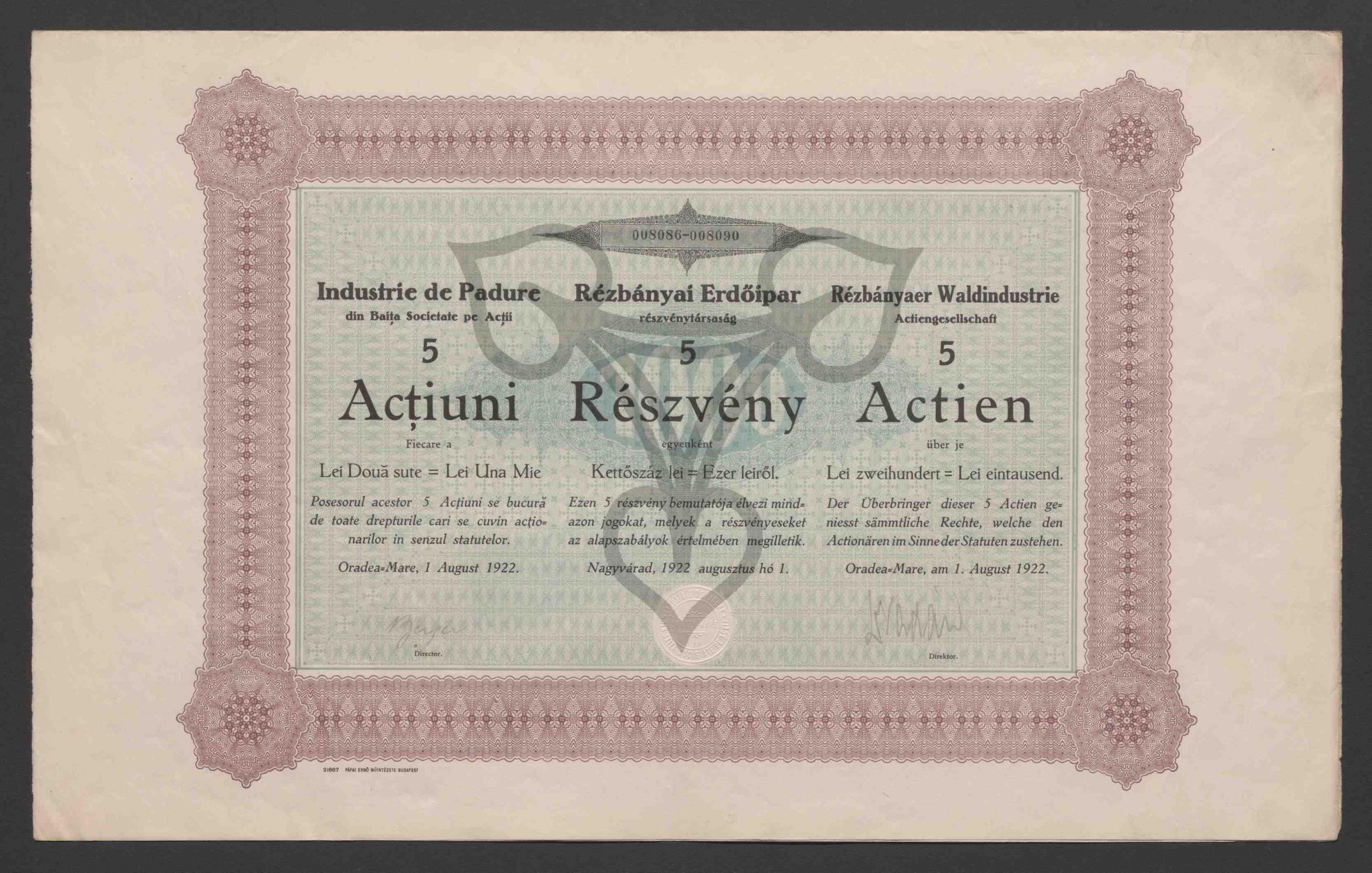 5 Aktie über je Lei zweihundert = Lei eintausend. 008086 – 008090