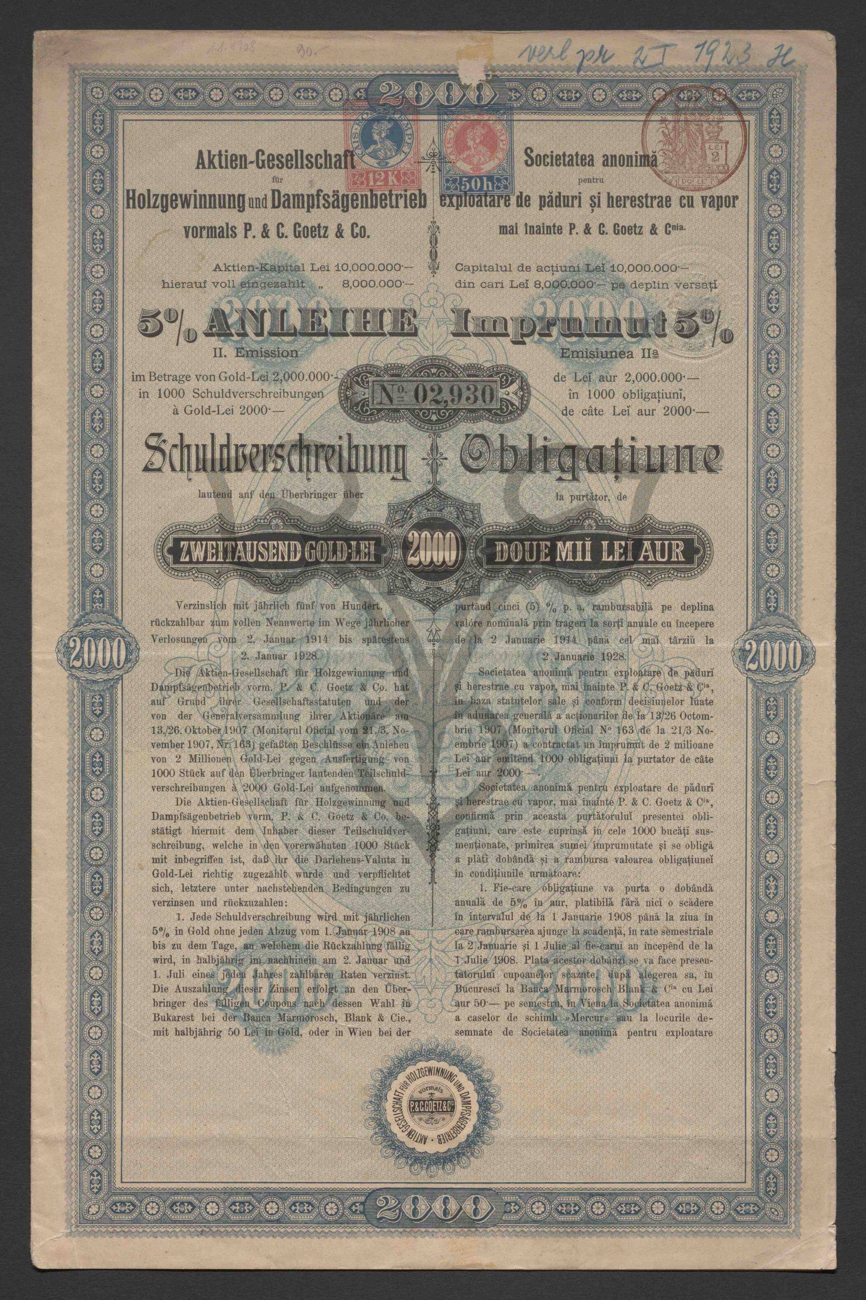 5 % Anleihe II. Emission, im Betrage von Gold-Lei 2.000.000 in 1.000 Schuldverschreibungen à Gold-Lei 2.000. Schuldverschreibung lautend auf den Überbringer über Zweitausend Gold-Lei, No. 02.930