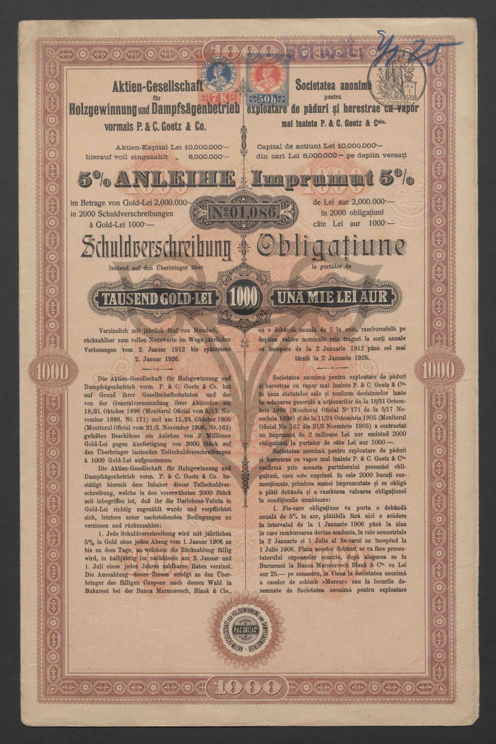 Originaltitel: Imprumut 5 % de Lei aur 2.000.000 în 2.000 obligaţiuni câte Lei aur 1.000. Obligaţiune la purtător de Una Mie Lei Aur, No. 01.086