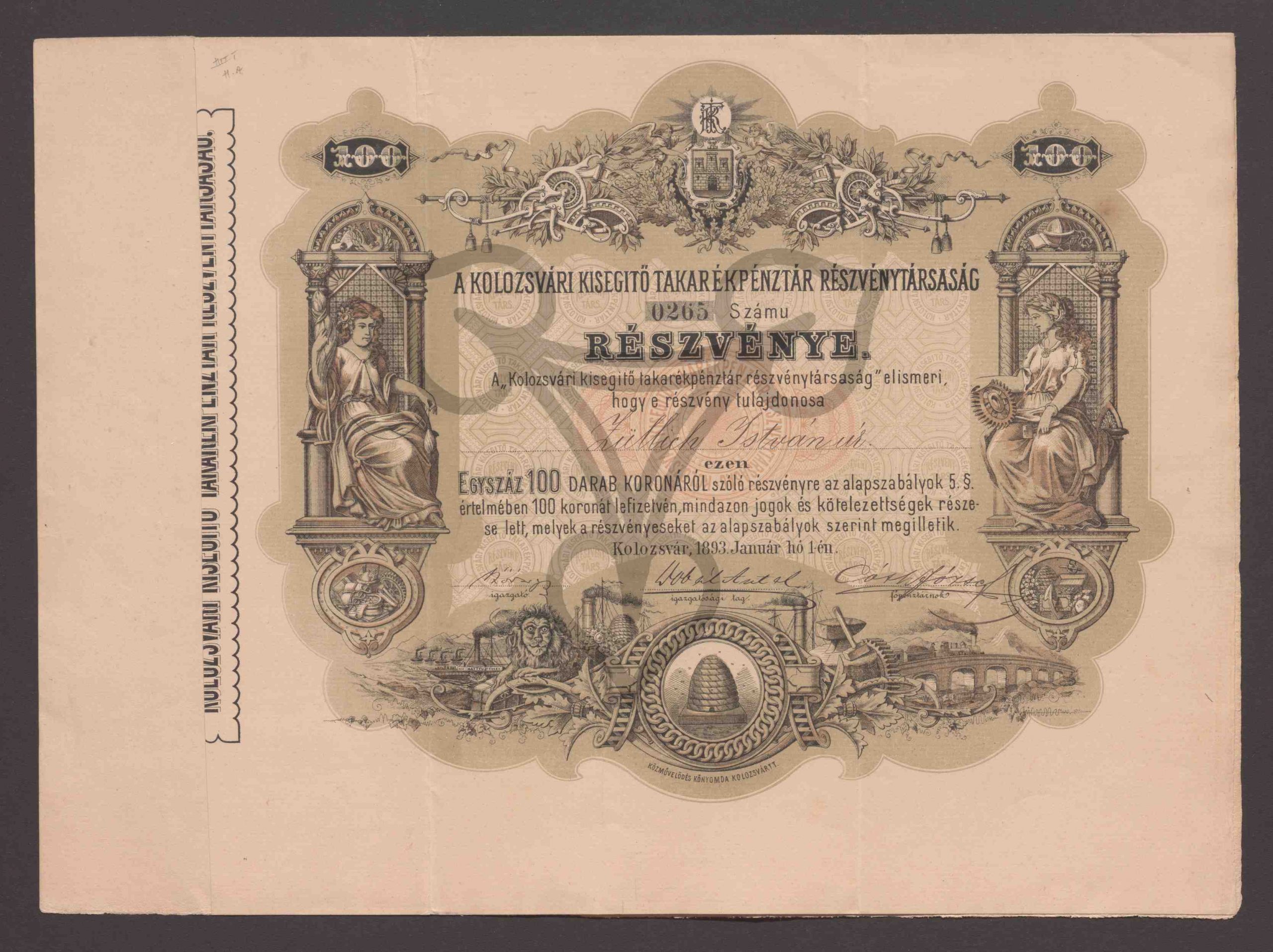 Originaltitel: Részvénye. Egyszáz 100 Darab Koronáról. 0265 számu
