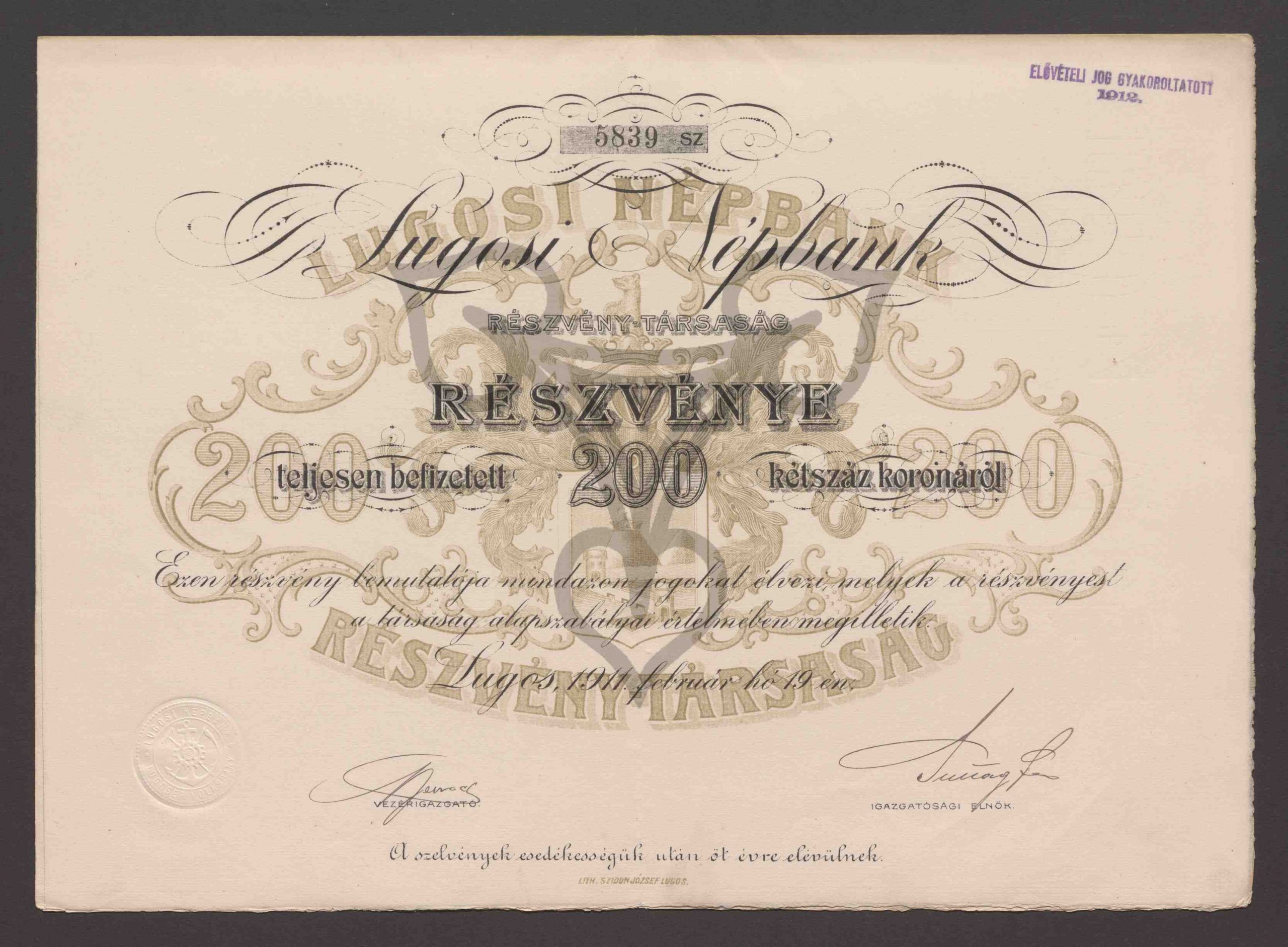Originaltitel: Részvénye teljesen befizetett 200 kétszáz koronáról. 5839 sz.