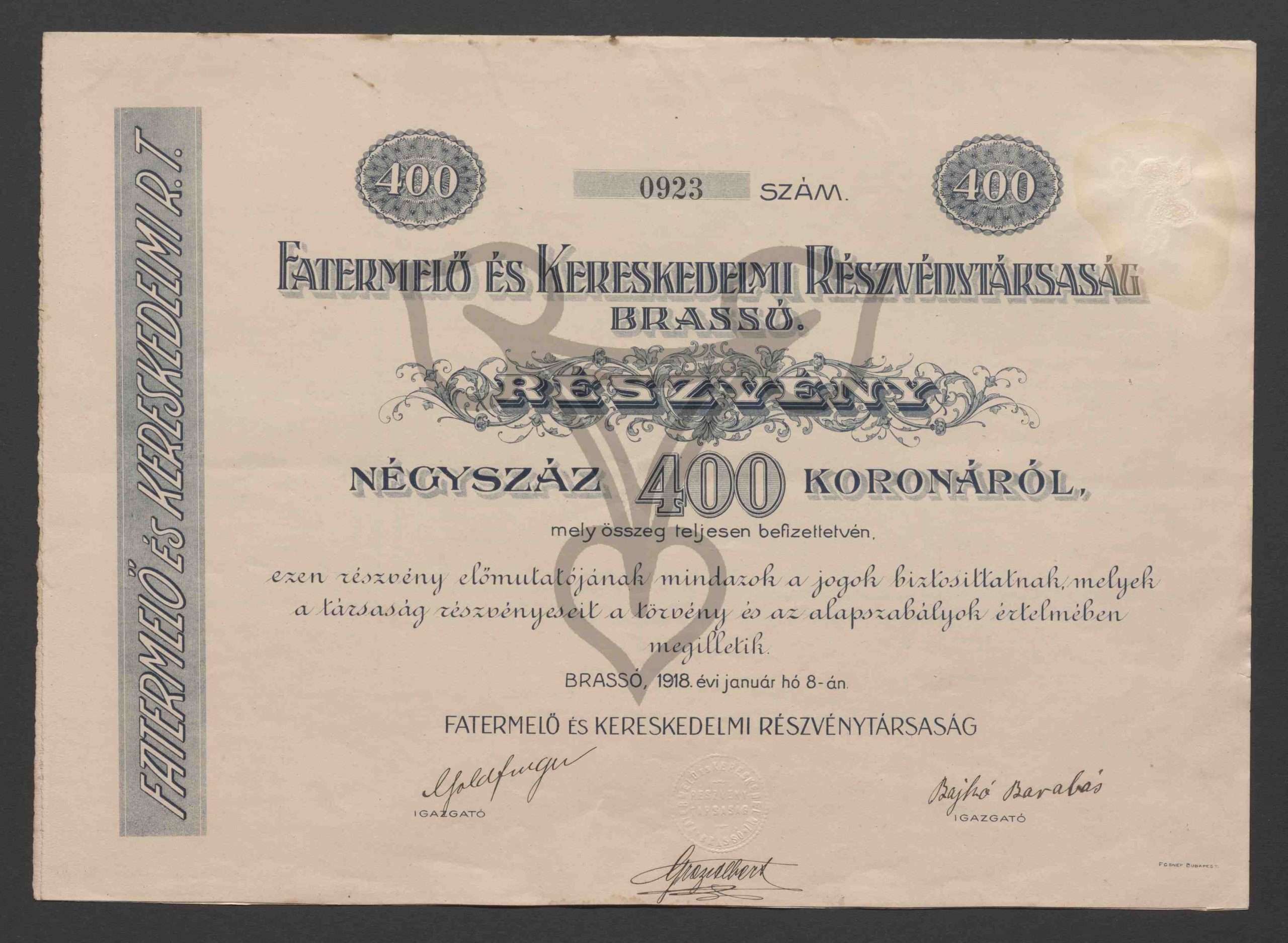 Originaltitel: Részvény. Négyszáz 400 Koronáról mely összeg teljesen befizettetvén. 0923 Szám