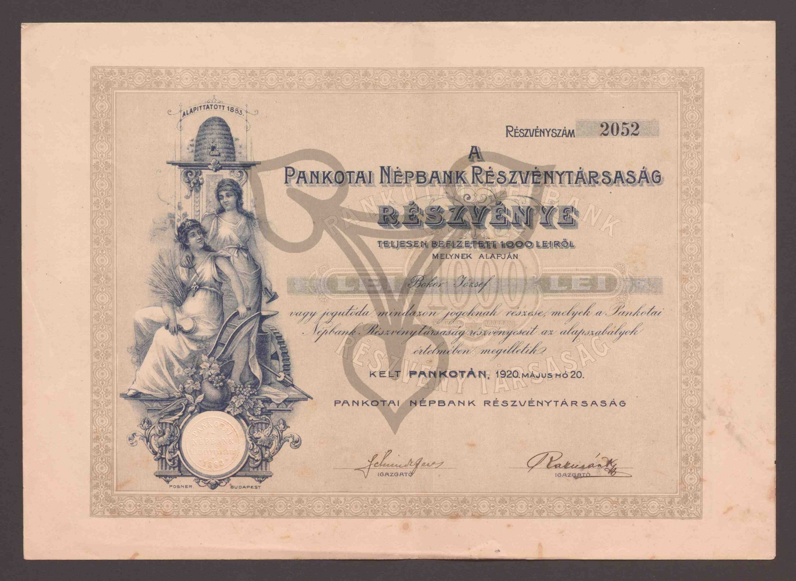 Originaltitel: Részvénye. Teljesen Befizetett 1000 Leiről. Részvényszám 2052