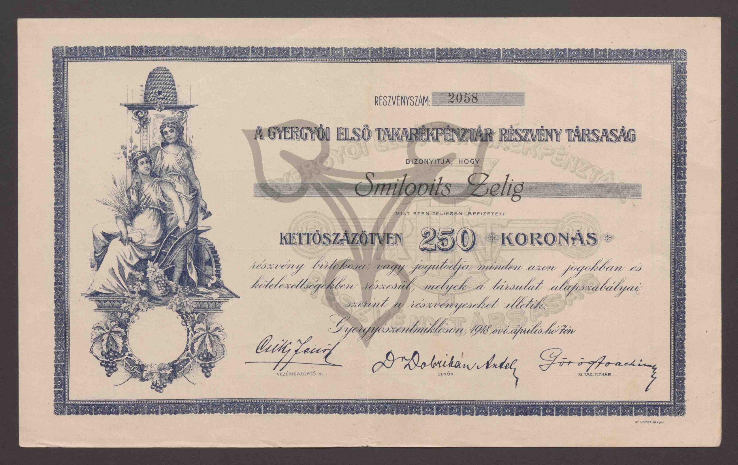 Originaltitel: Részvény. Kettőszázötven 250 Koronas. Részvényszám: 2058