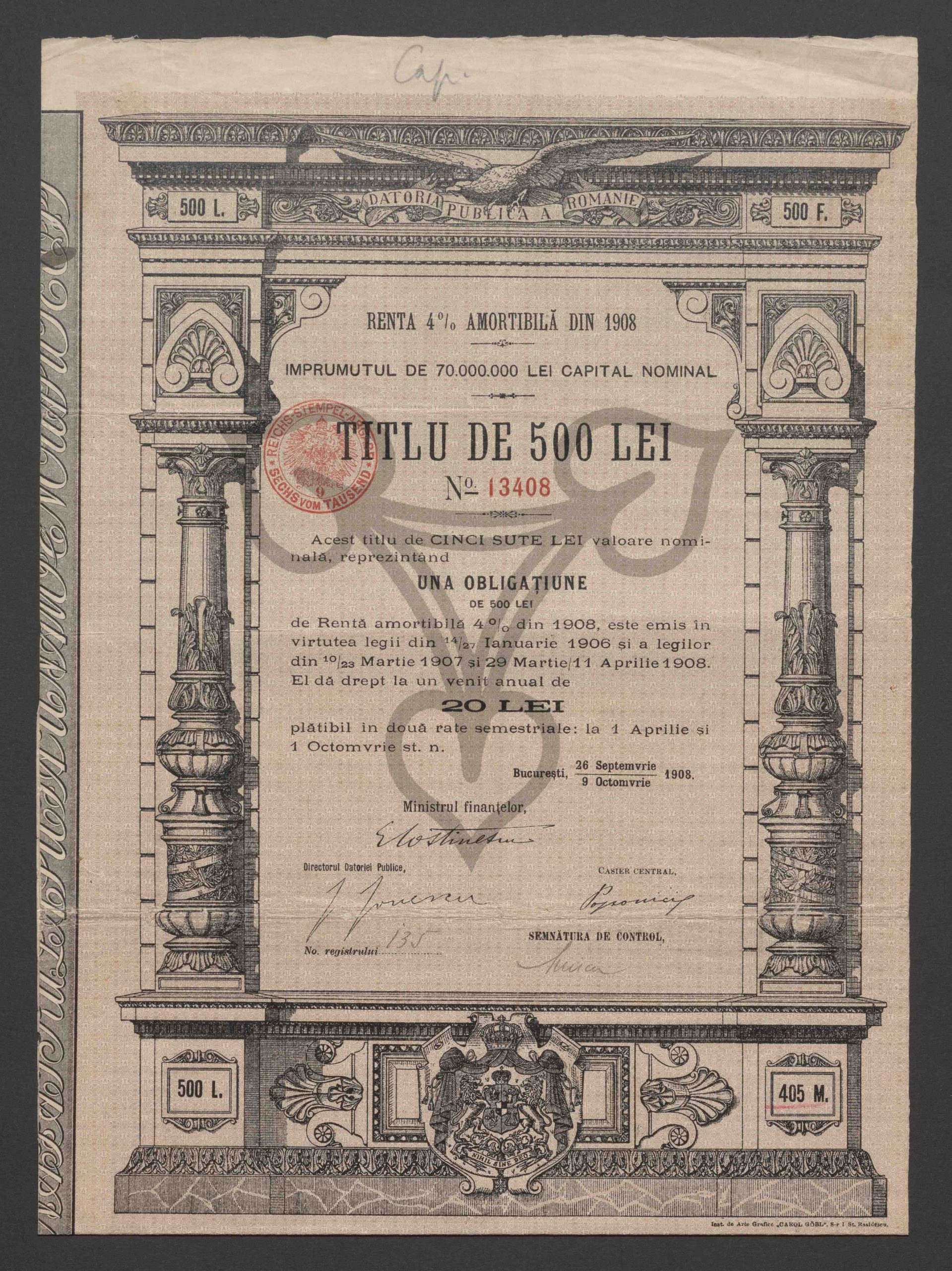 Originaltitel: Renta 4 % amortibila din 1908 Imprumutul de 70.000.000 Lei capital nominal, Titlu de 500 Lei, No. 13408