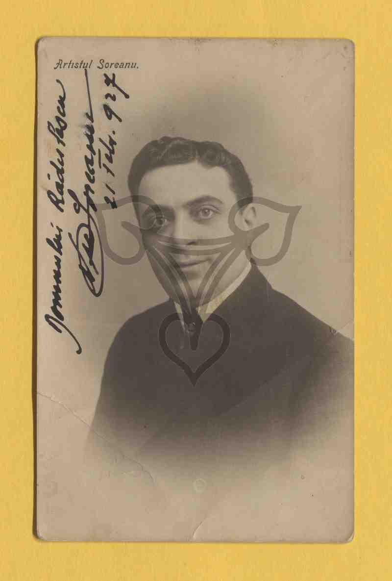 Studioaufnahme, neutraler Hintergrund. Halbbrustporträt. Der Schauspieler, in einen schwarzen Anzug mit weißem Hemd und dunkler Krawatte gekleidet, ist nach links gewandt und blickt in die Kamera.