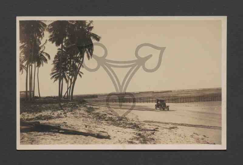 Auf einem breiten, teils mit Plamen bewachsenen Standstrand, ist ein Auto zu erkennen. In der rechten unteren Bildecke Treibgut, im Hintergrund, hinter einem Zaun, das Meer, in der oberen Bildhälfte wolkenloser Himmel.