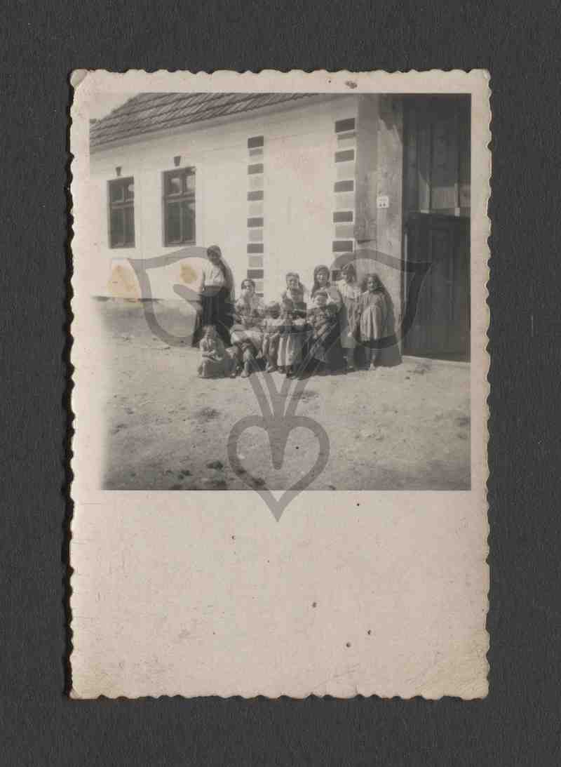 Eine Gruppe Bäuerinnen unterschiedlichsten Alters in rumänischer Arbeitstracht sind überwiegend sitzend neben dem Eingangstor eines Gebäudes aufgestellt und blicken in die Kamera.