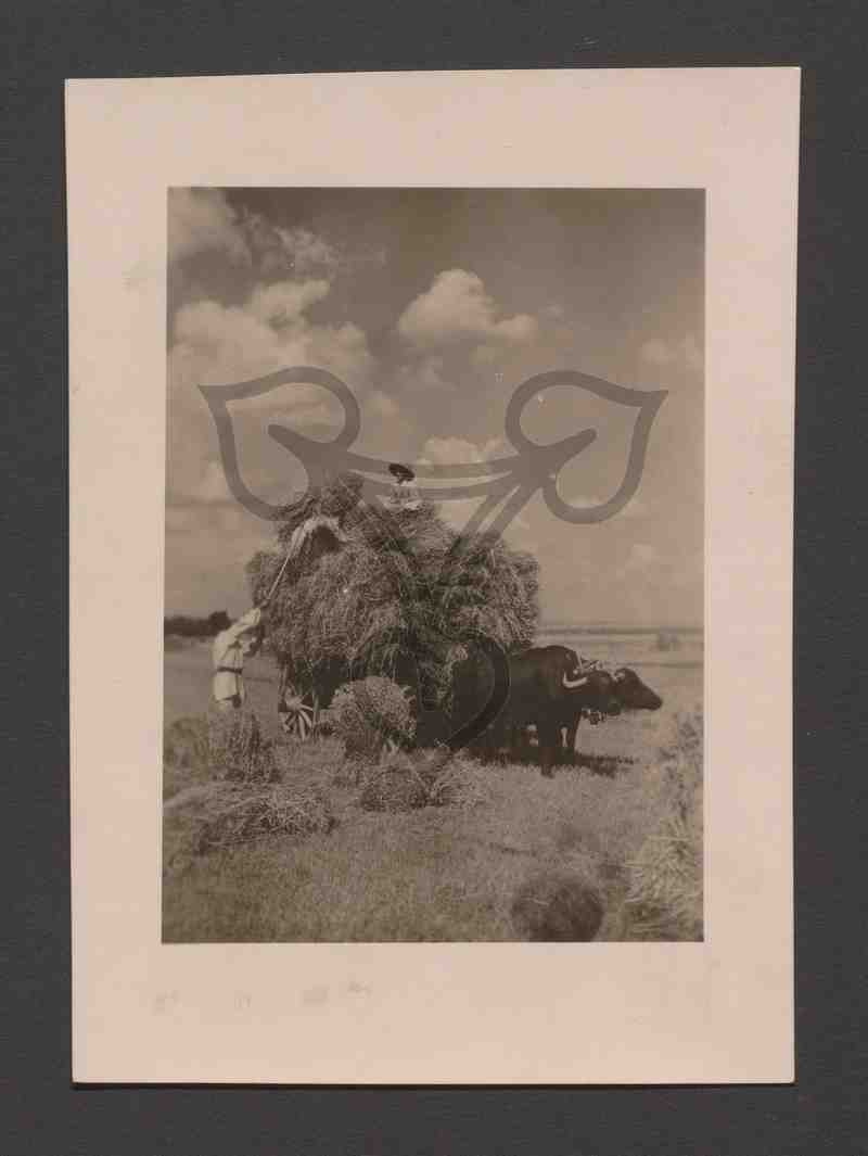Auf einem Feld steht ein mit Heu beladener Leiterwagen, vor den zwei Ochsen gespannt sind. Ein Mann in rumänischer Alltagstracht hebt mit einer Heugabel ein Bündel Heu hinauf auf den Wagen. Auf dem höchsten Punkt des Heus auf dem Wagen sitzt ein Junge, ebenfalls in rumänischer Alltagstracht, und nimmt den hochgehobenen Heuballen entgegen. Ihm Hintergrund Himmel mit weißen Wolken.