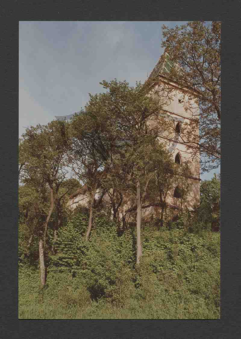 Turm und Kirchenschiff von Sträuchern und Bäumen verdeckt.