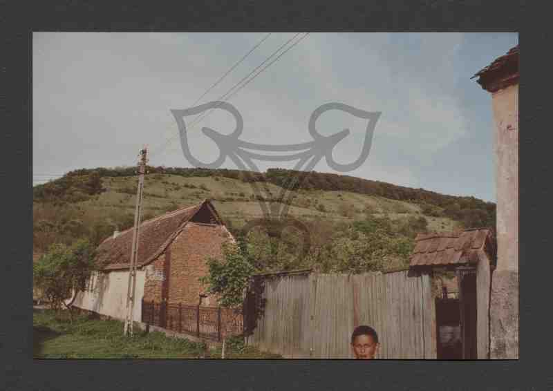 In der unteren Bildhälfte mittig links ein Bauernhaus, teils unverputzt, mittig rechts ein hölzerner Straßenzaun mit Tor und Tür. Am unteren Bildrand der Kopf eines Jungen. In der oberen Bildhälfte teils bewaldeter Hügel, darüber hellblauer Himmel.