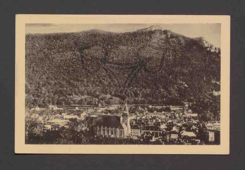 Blick von Nordosten auf die historische Altstadt Kronstadts vermutl. Nordöstlich vom Schwarzen Turm. Am unteren Bildrand mittig dominierend die Schwarze Kirche, rechts daneben die Gebäude des Honterus-Gymnasiums sowie weitere Gebäude und Dächer der Altstadt. Dahinter in den beiden oberen Bilddritteln der bewaldete Hügel der Zinne.