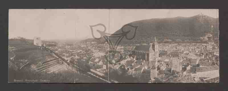 Panoramakarte. Mittig rechts ist dominierend von Nord-Westen (vermutl. vom Schwarzen Turm) die Schwarze Kirche zu sehen, rechts davon die Gebäude der historischen Altstadt, im Hintergrund die Zinne. Links mittig erkennt man den Rathausplatz mit dem Alten Rathaus, am linken Bildrand den Weißen Turm.