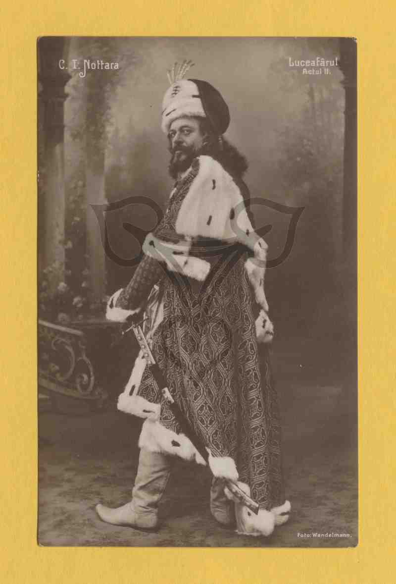 Studioaufnahme, gemalter Hintergrund mit Theaterrequisiten. Der Schauspieler steht in einem Bühnenkostüm nach links gewandt aufrecht da und blickt über die Schulter in die Kamera.