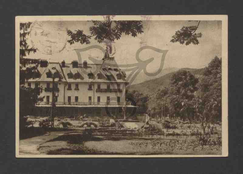 Blick auf das Hotel. Im Vordergrund eine Gartenanlage, im Hintergrund bewaldete Bergketten.