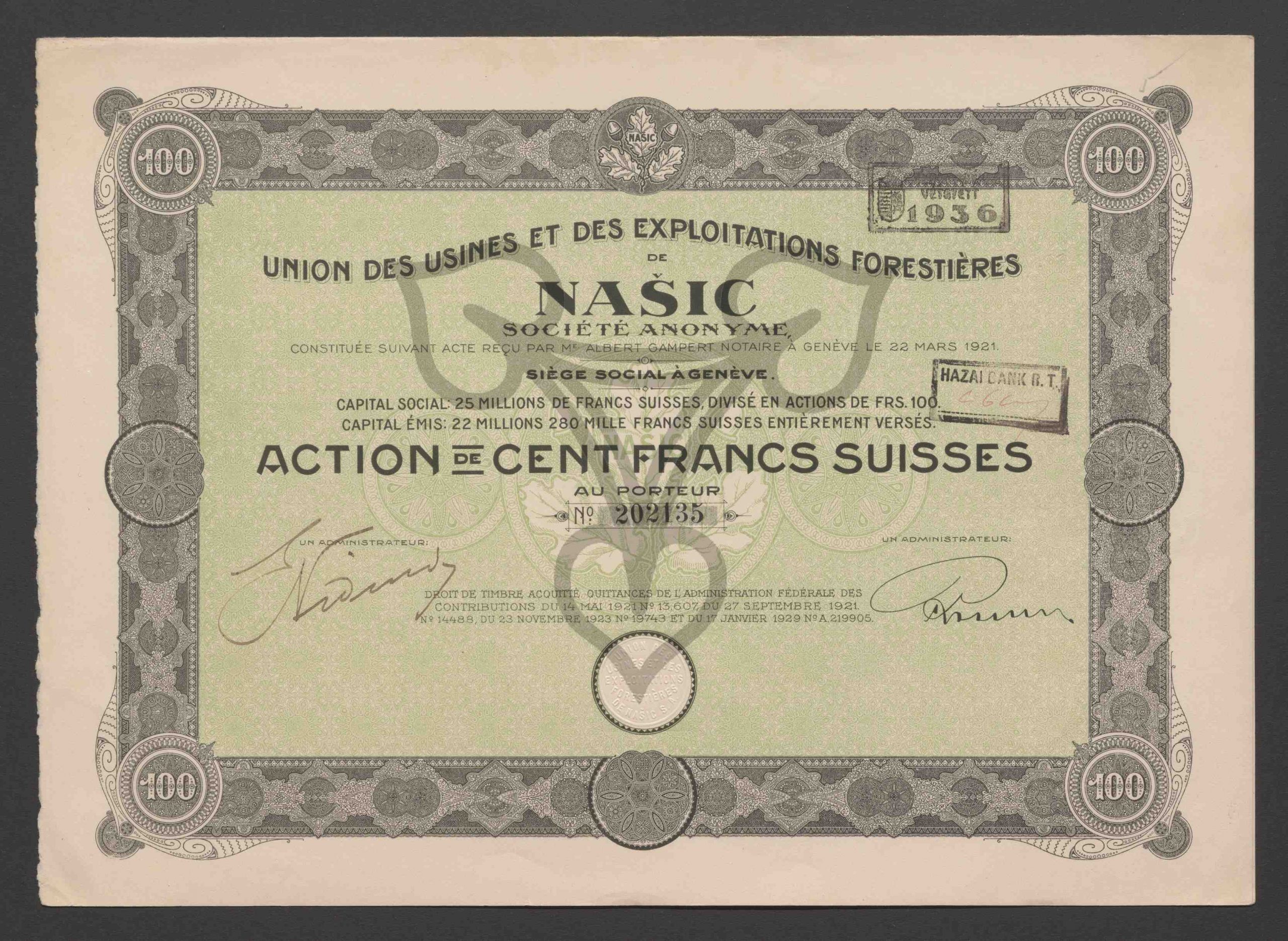 Capital Social: 25 Millions de Francs Suisses, Divisé en Actions de Frs. 100, Capital Émis: 22 Millions 280 Mille Francs Suisses Entièrement Versés. Action de Cent Francs Suisses au Porteur. No. 202135