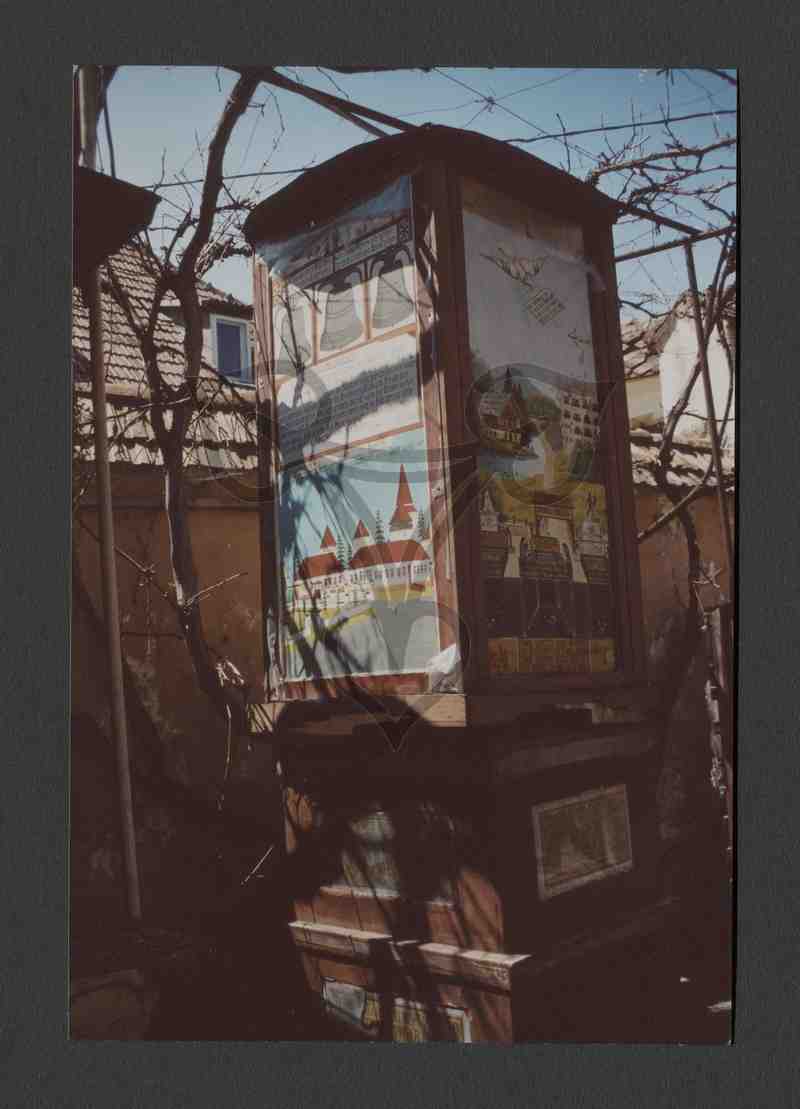 Zu sehen zwei Seiten mit gezeichneten Schaubildern hinter Glas in einer rechteckigen drehbaren Holzlitfaßsäule.