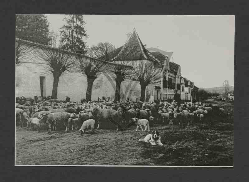 Reproduktion einer historischen Ansichtskarte. Blick von Südosten nach Nordwesten in die Dorfgasse entlang der Umfassungsmauer der Kirchenburg. Im Vordergrund am unteren Bildrand mittig rechts ein Schäferhund, dahinter die große Schafherde mit Hirten. In der oberen Bildhälfte die Außenseite der Umfassungsmauer, der südöstlichste Eckturm sowie die anschließende Häuserzeile.