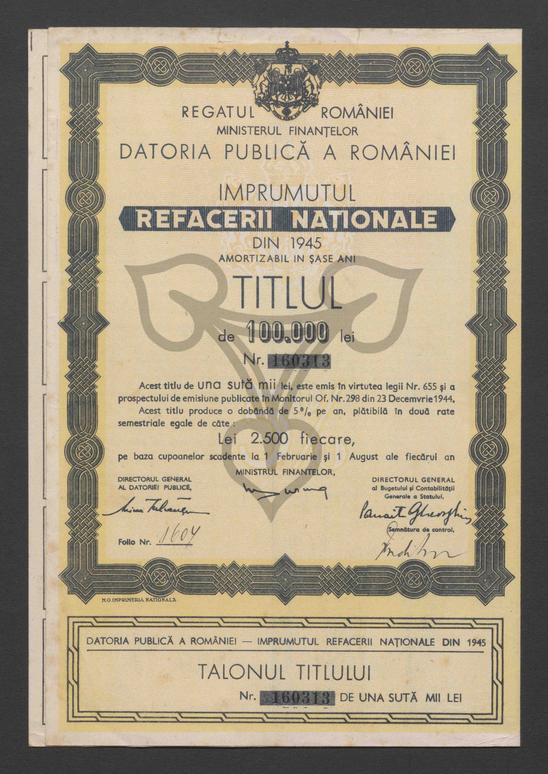 Darlehen für den Wiederaufbau von 1945, Wertpapier über 100.000 Lei, Nr. 160313