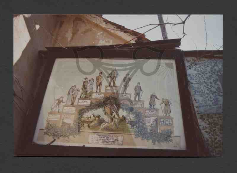Zu sehen ist ein gezeichnestes Schaubild, in dem die Lebensphasen des Mannes vom Kind bis ins Greisenalter auf einer Treppe stehend dargestellt wird. Unter dem Treppenbogen Eva, wie sie im Paradies Adam den Apfel reicht.