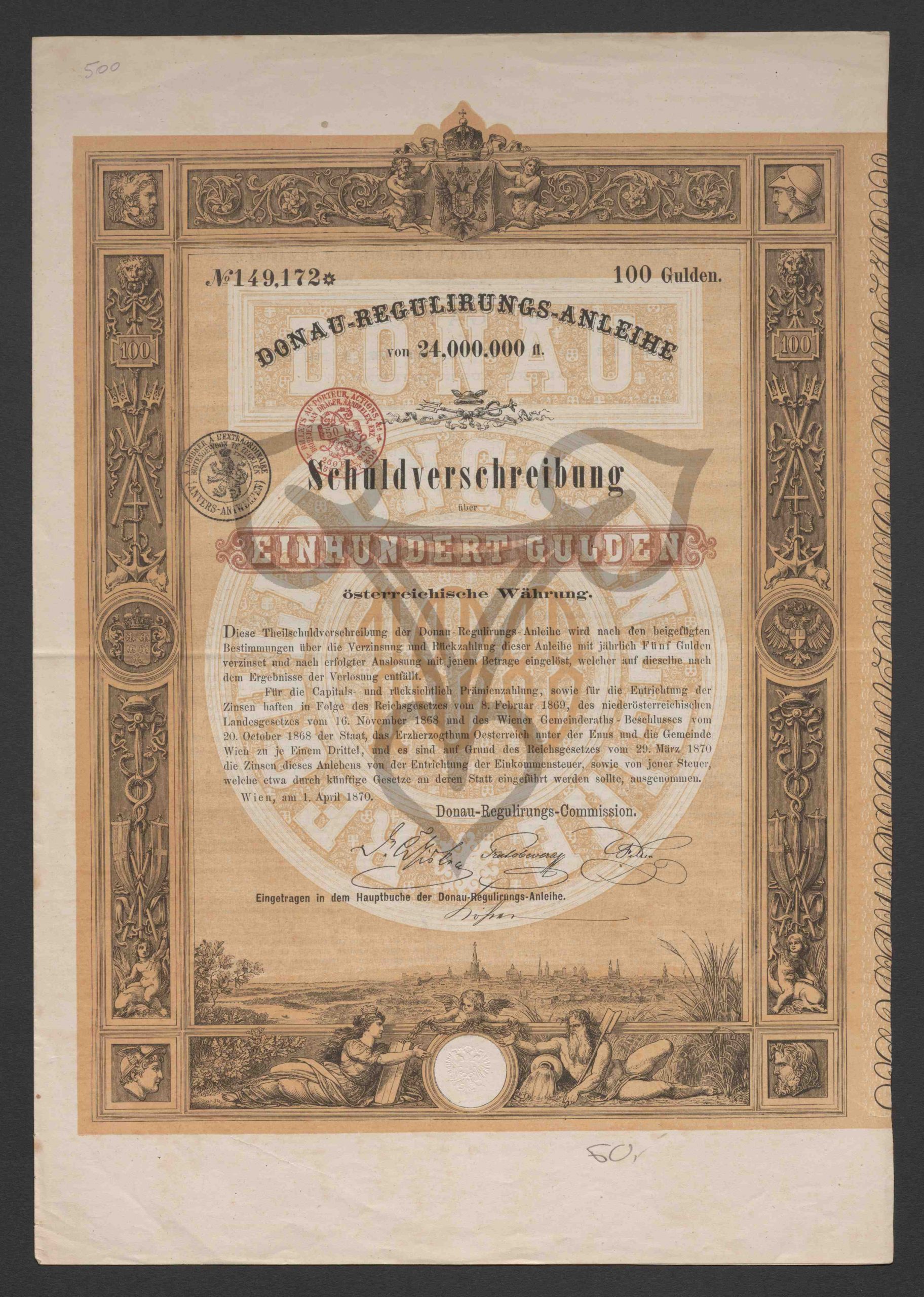 Donau-Regulirungs-Anleihe von 24.000.000 fl. Schuldverschreibung einhundert Gulden österreichische Währung; No. 149.172