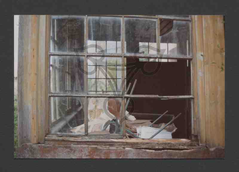 Blick durch das halb verfallene Fenster eines Schuppens in dessen Inneres.