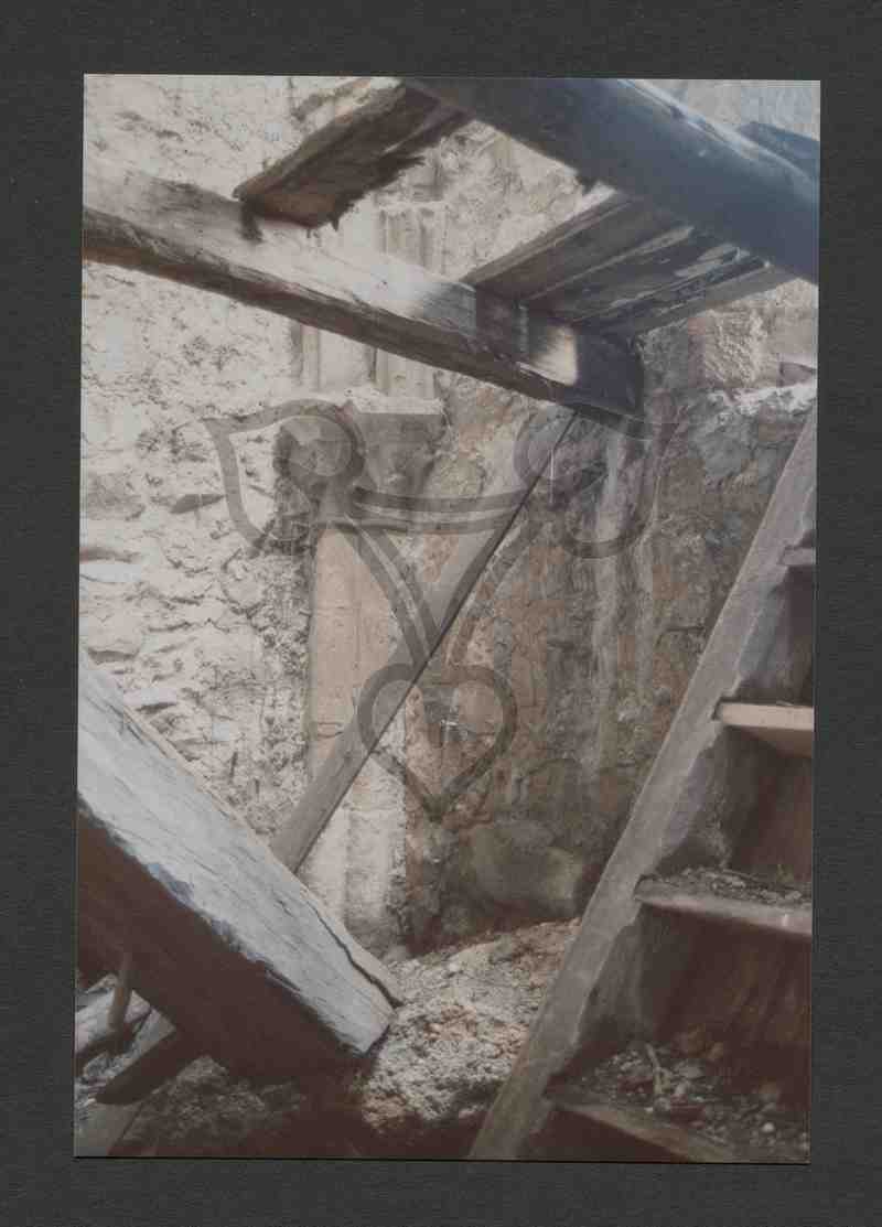 Innenansicht einer Etage des Glockenturms. Am rechten Bildrand eine nach oben führende Holzleiter, rechts davon, Bildmittig, in der Ecke des Raumes ein gotischer Strebepfeiler.