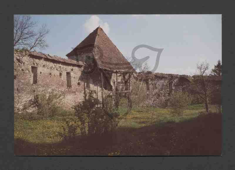 Blick auf die Innenseite Wehrmauer der Kirchenburg mit einem der quadratischen vorgelagerten Türme.