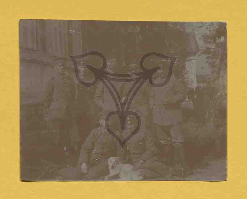 Gruppenbild mehrerer Soldaten. Fünf stehen, in der vorderen Reihe sitzen zwei auf dem Boden, der rechte krault einen liegenden weißen Hund. Im Hintergrund ein Gebäude, rechts daneben eine Hecke, dahinter weitere Gebäude.