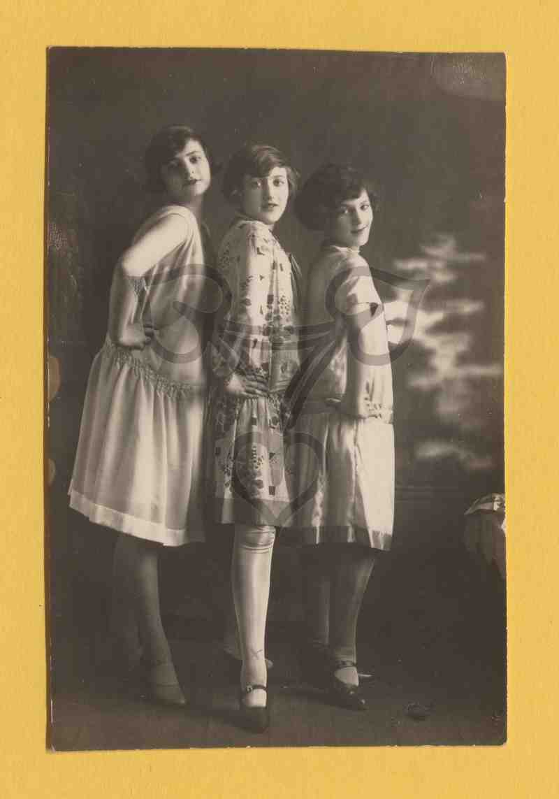Studioaufnahme, neutraler Hintergrund. Die drei Mädchen, alle mit hellen, teils bunt gemusterten Kleidern und dunklen Schuhen bekleidet, stehen hintereinander nach rechts gewandt und blicken in die Kamera.