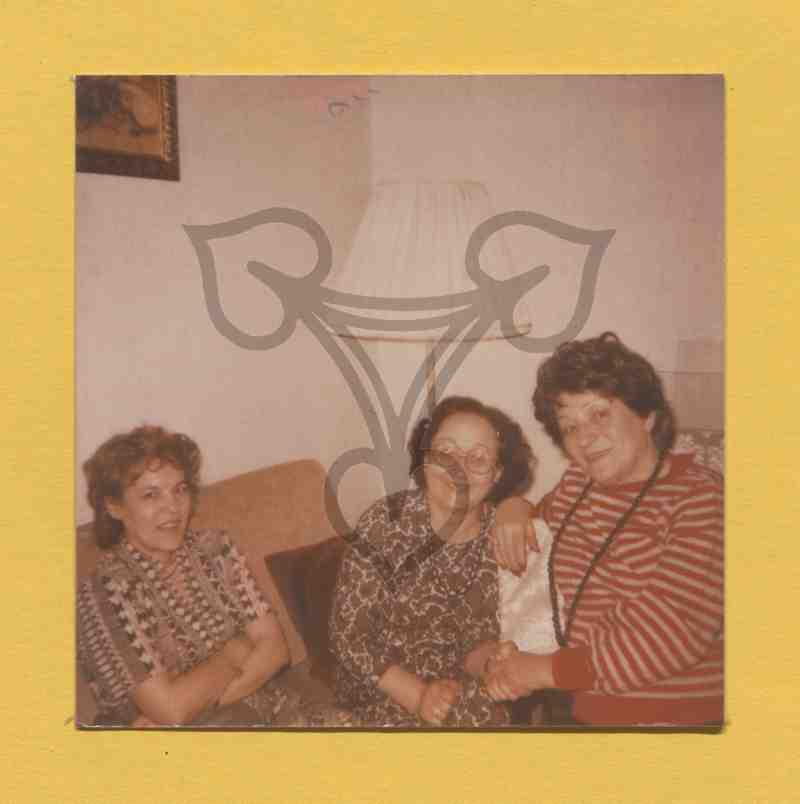 Die Frauen sitzen in einem Wohnzimmer nebeneinander auf einem Sofa mit hellbraunem Bezug und blicken in die Kamera. In der Raumecke hinter ihnen steht eine Stehlampe mit weißem Schirm, in der linken oberen Bildecke ist ein Gemälde angeschnitten.