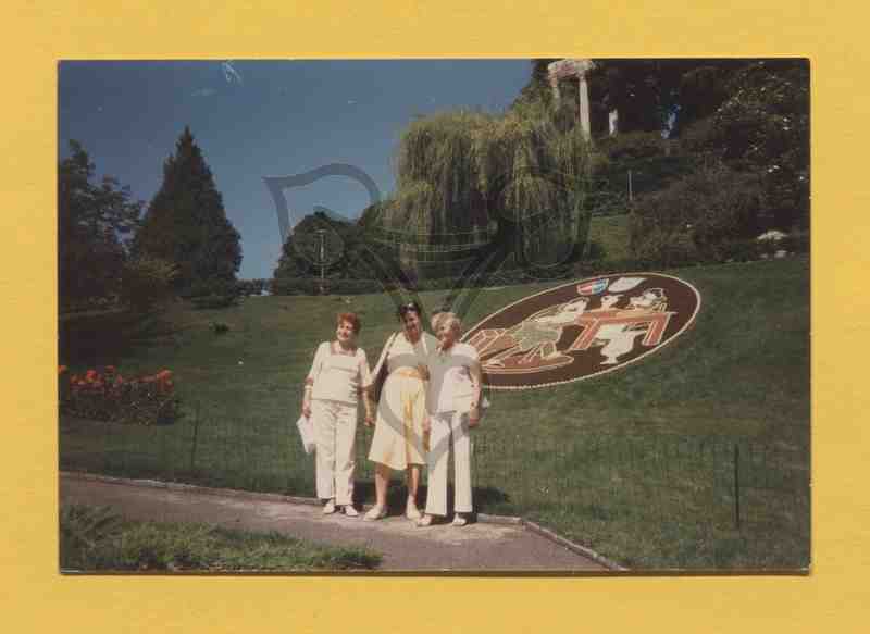 Die drei Frauen stehen nebeneinander im Freien in einem Park auf einem geschotterten Weg. Auf der Grünfläche hinter ihnen ein Drahtzaun, dahinter ein großes kreisförmiges Blumenbeet mit figürlichen Darstellungen, dahinter, hangaufwärts, Büsche, Bäume und eine künstliche Ruine.