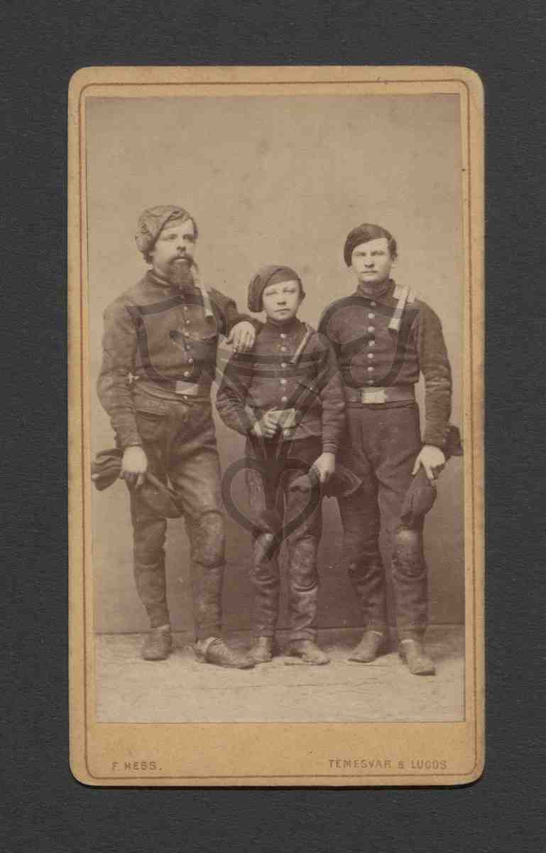 Zwei erwachsene Männer flankieren einen Lehrjungen(?). Alle drei tragen eine uniforme Arbeitskleidung.