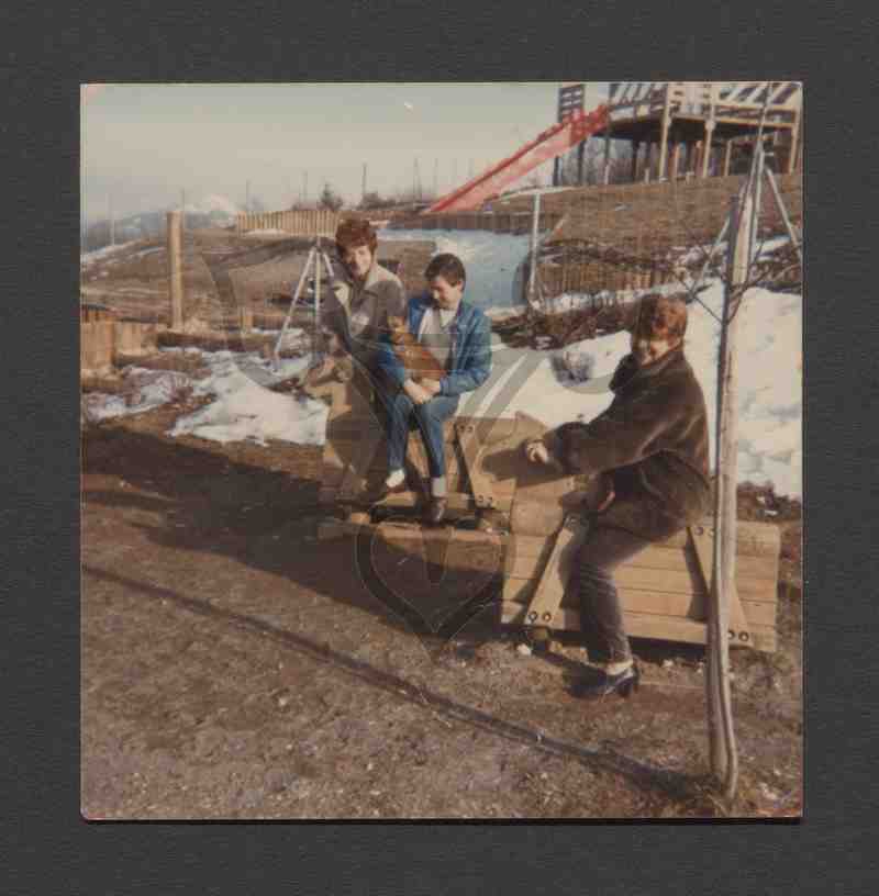 Auf einem teils verschneiten Spielplatz sind drei Personen zu sehen. Die Frau ganz links steht hinter einem Holzpferd, auf dem eine in blau gekleidete Person sitzt, die einen Hund auf dem Schoß hält. Die Frau ganz rechts sitzt ebenfalls auf einem Holzpferd. Im Hintergrund weitere Spielgeräte aus Holz.