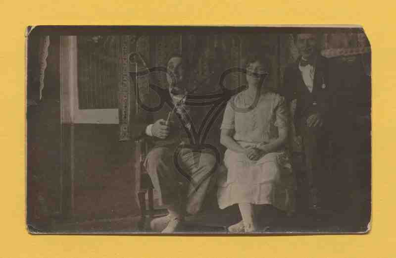 Zwei der drei Schauspieler, ein Mann und eine Frau, sitzen auf einer Bank, der dritte, ein Mann, steht rechts neben der Frau. Alle sind sie in Bühnenkostümen gekleidet und blicken links an der Kamera vorbei. Aufnahme vermutlich in Theaterkulissen.