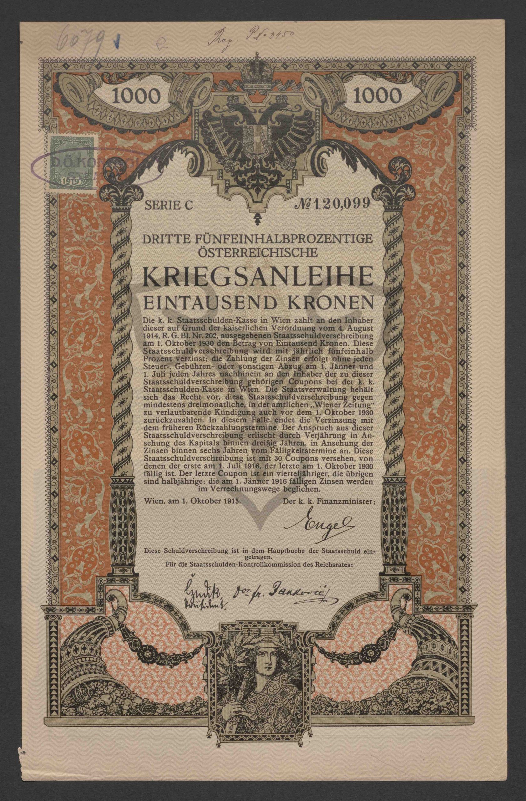 Dritte fünfeinhalbprozentige Österreichische Kriegsanleihe. Eintausend Kronen, Serie C, No. 120.099