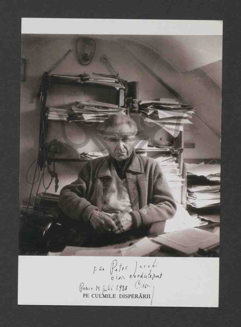 Cioran sitzt an seinem Schreibtisch und blickt in die Kamera. Im Hintergrund Regale überfüllt mit Papieren und einem Telefon.