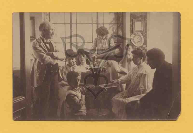 In einem Raum mit großer Glasfront sitzt die Familie um einen Tisch herum, auf dem ein Grammophon steht. Ganz links das Familienoberhaupt, rechts von dem Mann zwei Mädchen, vor diesen ein Junge, im Hintergrund rechts neben den Mädchen eine Frau (Kindermädchen?), ein weiteres, kleineres Mädchen rechts davon, Frau Roth sowie ein weiterer Mann in dunklem Anzug.