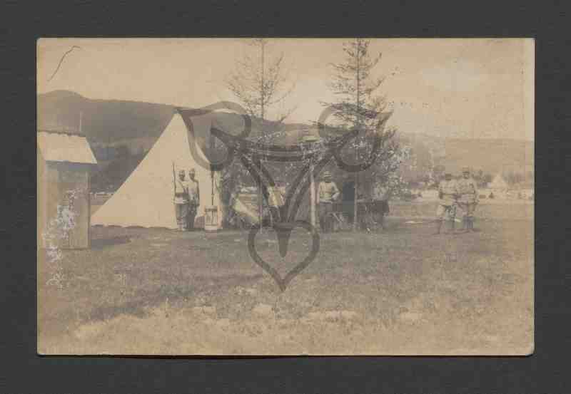 Auf einer Grünfläche sind eine Holzhütte, ein Zelt im Vordergrund, mehrere im Hintergrund, sowie vor einigen Bäumen mehrere Soldaten in rumänischer Uniform des Ersten Weltkriegs (Modell 1912) zu erkennen.