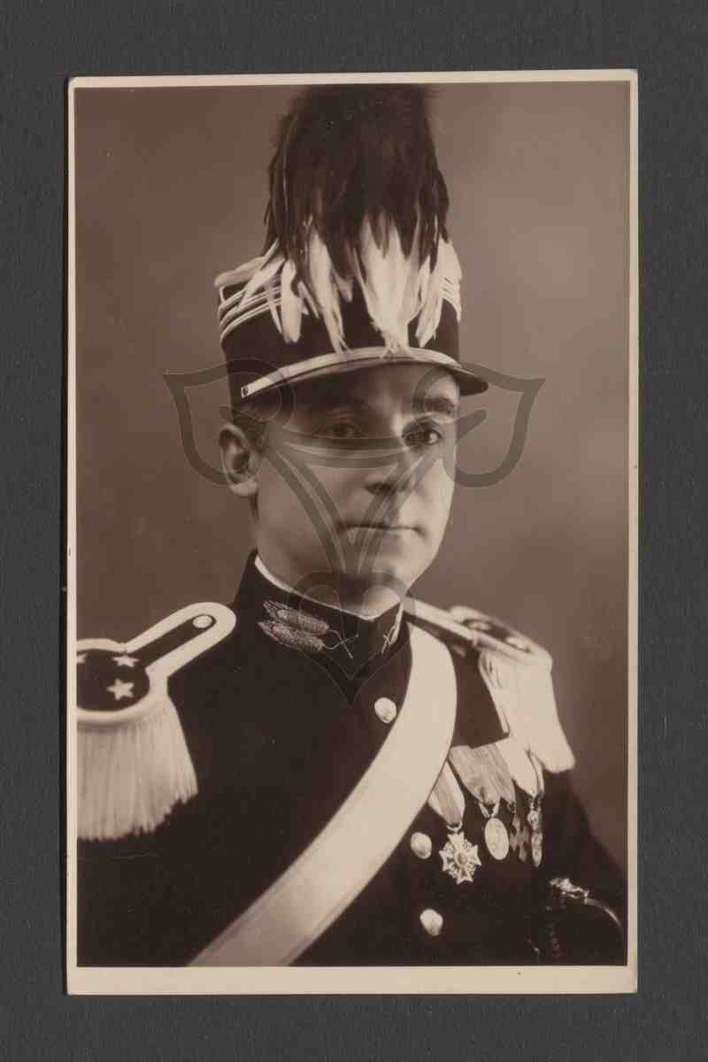 Studioaufnahme, dunkler Hintergrund. Halbbrustporträt. Der Soldat in rumänischer Uniform mit Epauletten, in denen drei Sterne stecken, blickt rechts an der Kamera vorbei. Er trägt eine dunkle Schildmütze mit Federschmuck und Orden an der Brust.
