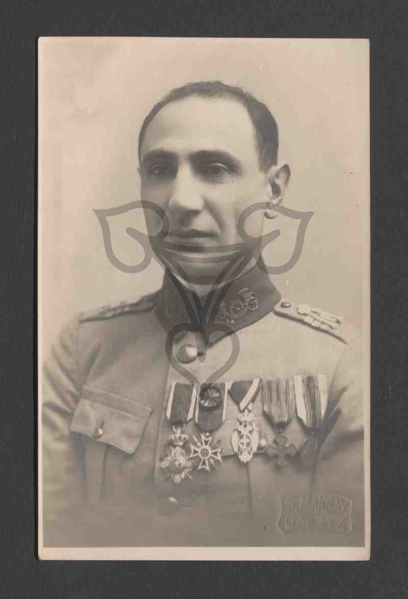 Studioaufnahme, neutraler Hintergrund. Halbbrustporträt. Der Soldat in rumänischer Uniform mit fünf Orden an der Brust blickt links an der Kamera vorbei. In der rechten unteren Ecke Prägestempel des Fotografen.
