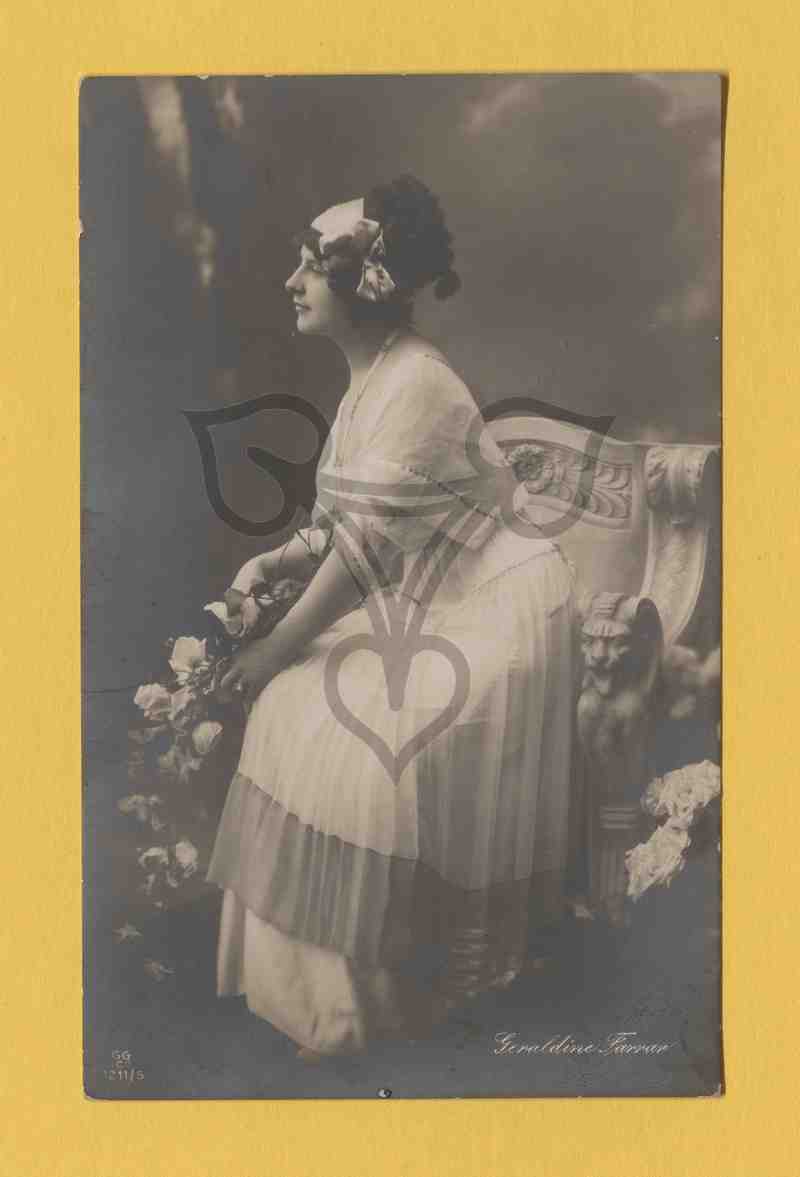 Studioaufnahme, gemalter Hintergrund, Sessel Requisite. Der Opernsängerin sitzt in einem Bühnenkostüm nach links gewandt auf einem Sessel und blickt nach links.