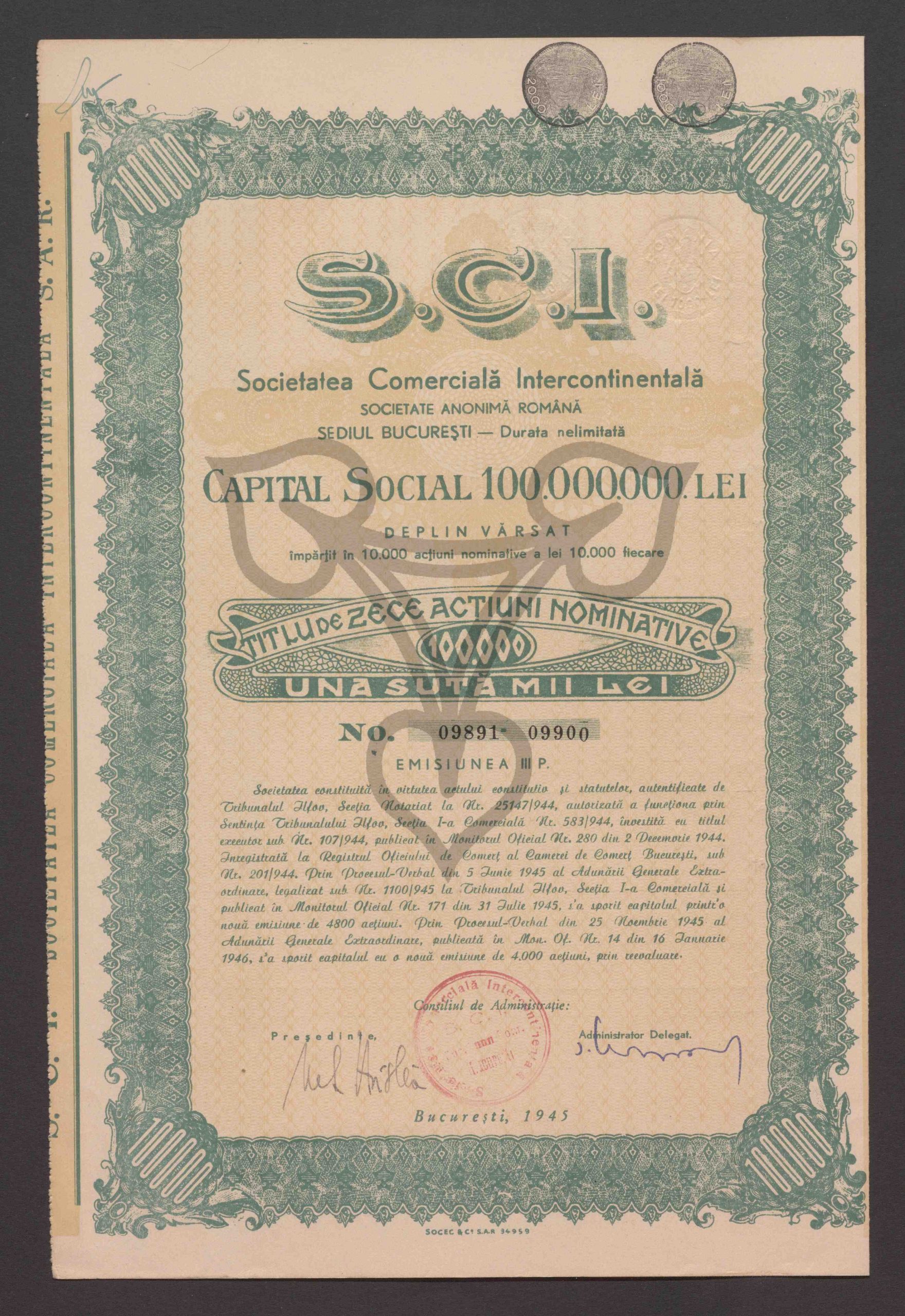 Gesellschaftskapital 100.000.000 Lei voll eingezahlt Aufgeteilt in 10.000 Namensaktien zu je 10.000 Lei. Titel von zehn Namensaktien zu hunderttausend Lei. Nr. 09891 – 09900, Ausgabe III P.